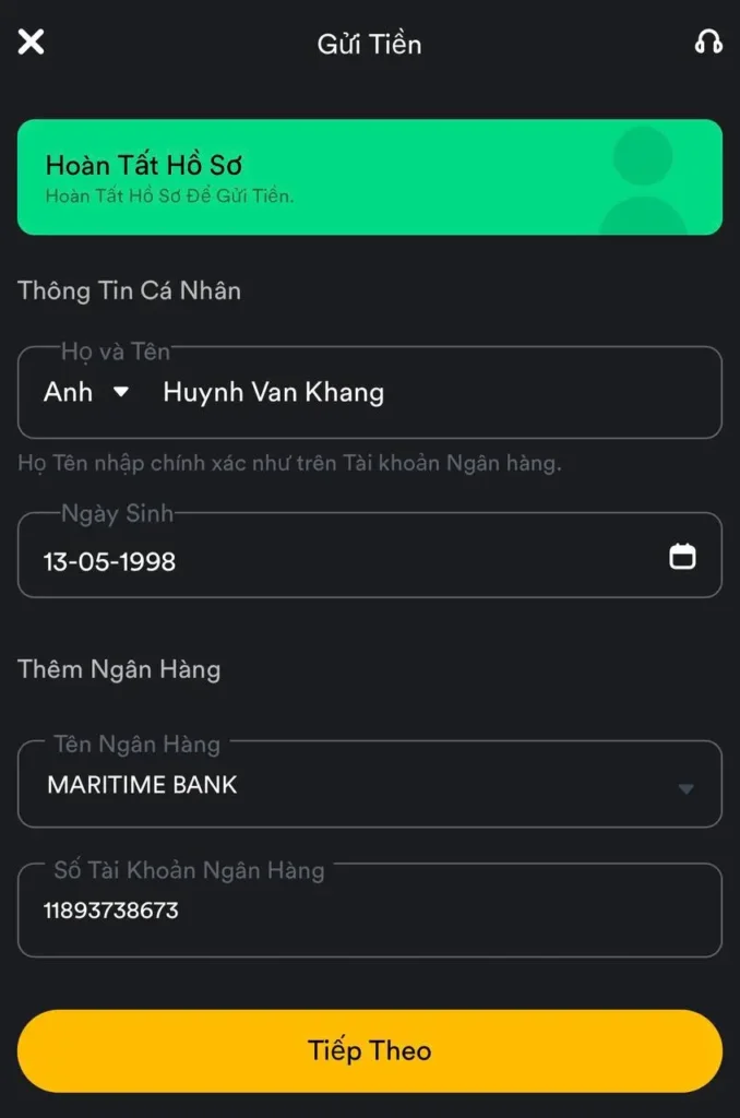 - Họ và tên: Điền tên chủ tài khoản dùng để giao dịch.